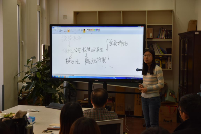 荣喜民教授团队汇报分享了最新的研究成果,其中荣喜民教授做了题为“Dynamics of financial market”的学术报告,赵慧老师做了题为“随机保费收入的保险投资模型”的报告;博士生王愫新做了题为“Optimal investment strategies and intergenerational risk sharing for different pension plans”的报告。