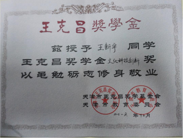 王新宇荣获王克昌奖学金
